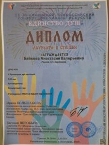 Наши самые искренние и тёплые поздравления Байковой Анастасии за её победу во II Инклюзивном всероссийском конкурсе-фестивале искусств «Единство душ» и получении диплома лауреата II степени. Это говорит не только о большом таланте, но и о невероятном трудолюбии, усердии и силе духа. Тема работы — «У лукоморья дуб зелёный» — особенно символична. Она говорит о глубокой …